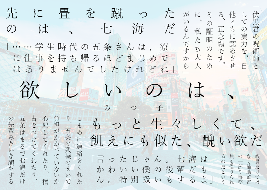 欲しいのは、【五七】 | みつ子 #pixiv https://www.pixiv.net/novel/show.php?id=... 12月に発行予定のサンプルを上げました。ちゃんと「先生」やってる5×いろいろ貪欲な7の、10月のある1週間の話です。