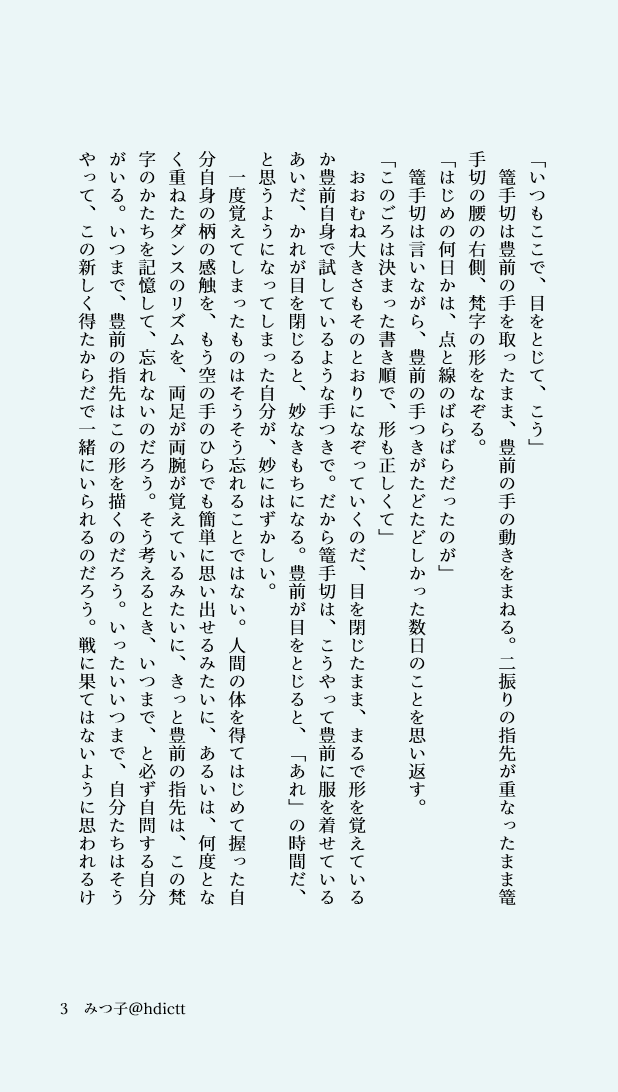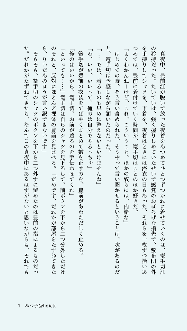 こてぎりがほそかわといなばを行き来した話がとてもとても好きなので、かせんの呼び捨ても、その行き来のつど親密になって結果的に220x年には「応援してくれ!」くらい気のおけない仲になったんだったら可愛いな 6年以上前 (2019.12.12) twilog