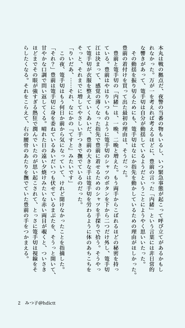 来年の夏コミ(C98/5月)申し込みました!!!11月に出したコピー本の短編 https://roka30.booth.pm/items/1657021 を含むみほとせ+あおさく小説を書きます。カップリングはないよ。石切丸は最終的に例の手記を燃やさねばならないのではないかという話(仮)です。 6年以上前 (2019.12.26) twilog