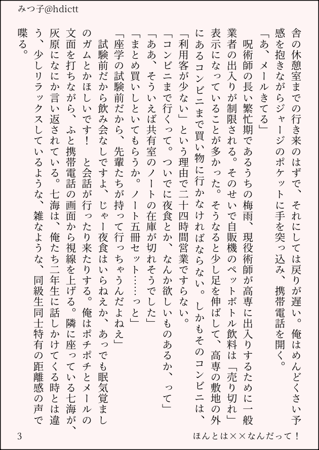 まじめに223話の何が一番しんどかったかって伊地知くんの「逃げる勇気もなかった」というモノローグ 自分はここまでだ(ここまでしかできない)って認めて逃げることを決意するのにどんだけのエネルギーがいることか しかも渋谷の七海の話では伊地知くんは元々術師志望だったんでしょ そんなさあ 2年以上前 (2023.5.22) twilog