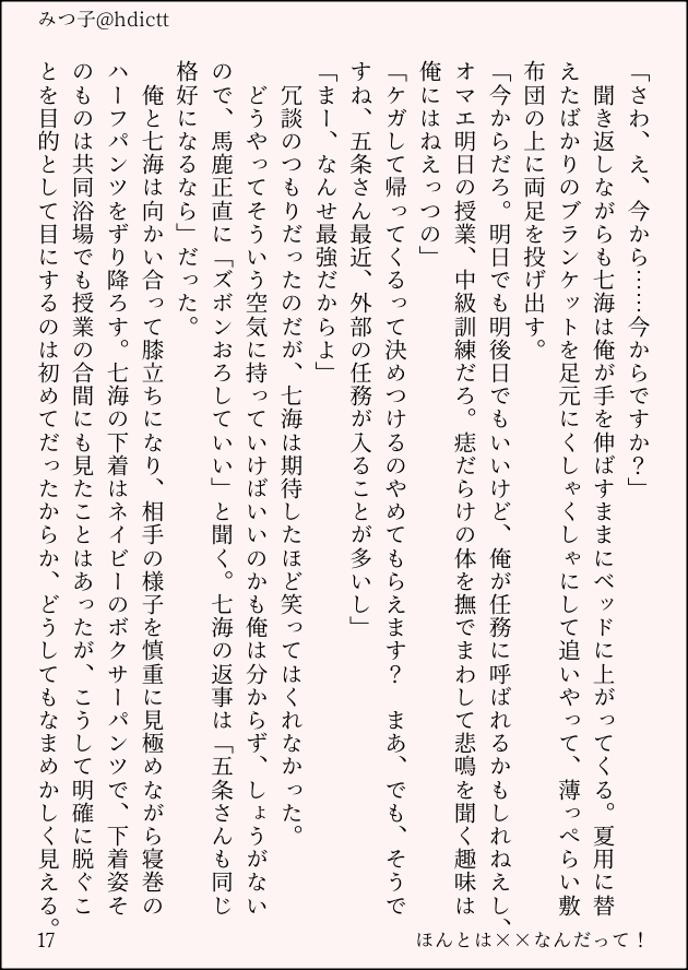 若ナナチャンが、ゴのグサグサグサ事件(まろやか表現)を、アレで強くなれたとして周りの大人が喜ぶのクソじゃないですか!って憤ってほしいんだな〜五七はそういう愛なんだな〜 そしてゲはもう曇りつつあるので、ゴに対してちょっと態度が変わっているといい 2年以上前 (2023.5.28) twilog
