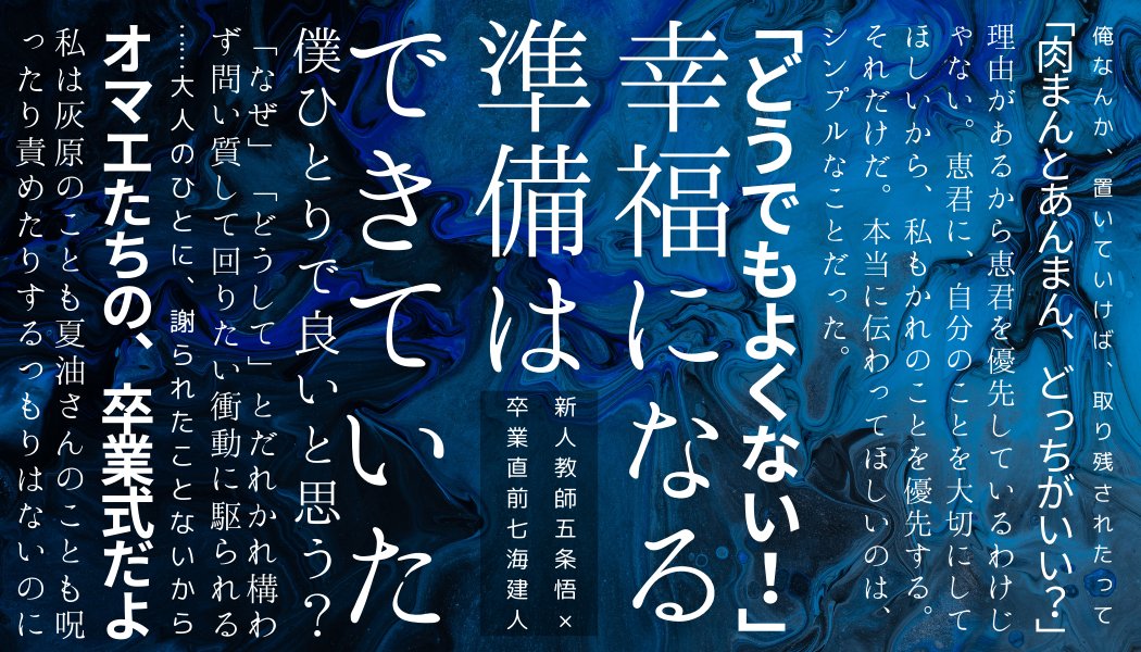 【五七】幸福になる準備はできていた⑨ https://www.pixiv.net/novel/show.php?id=... 新人教師5×術師を辞めたい学生7つづき。幼メとの任務で自分の中の強い意思を露わにする7。でも別れのタイムリミットが近づく中、5の気持ちを受け止めきれずにいて…の回。通販 https://ec.toranoana.jp/joshi_r/ec/item/...