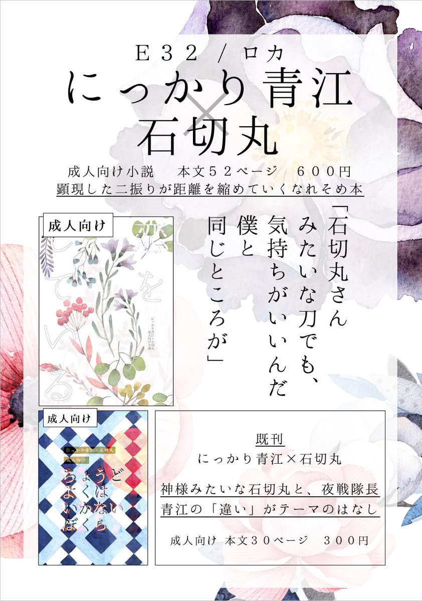 #あいのり和泉国お品書き #あいのり和泉国新刊情報 【E32】にか石なれそめ(ちょっとすけべ)ブックです 馬で出陣する丸とか脇差らしい江とか楽しく書きました!既刊もにか石。よろしくお願いします
