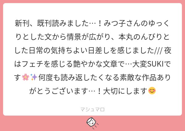 本、手にとっていただいてありがとうございます!とても素敵な本丸の景色を想像しながら読んでいただいたようでめちゃめちゃ嬉しいです…!人の姿で人みたいな暮らしを楽しんでるかれらが私も大好きです。→